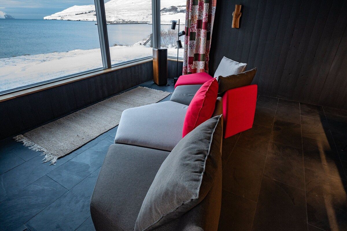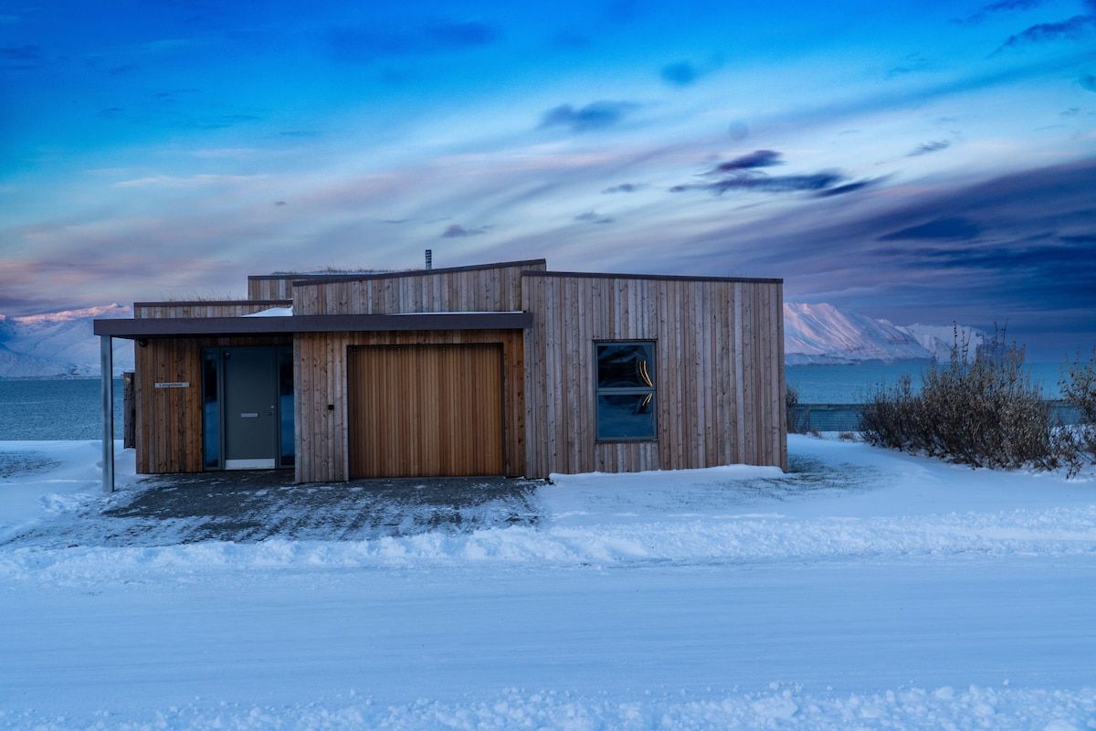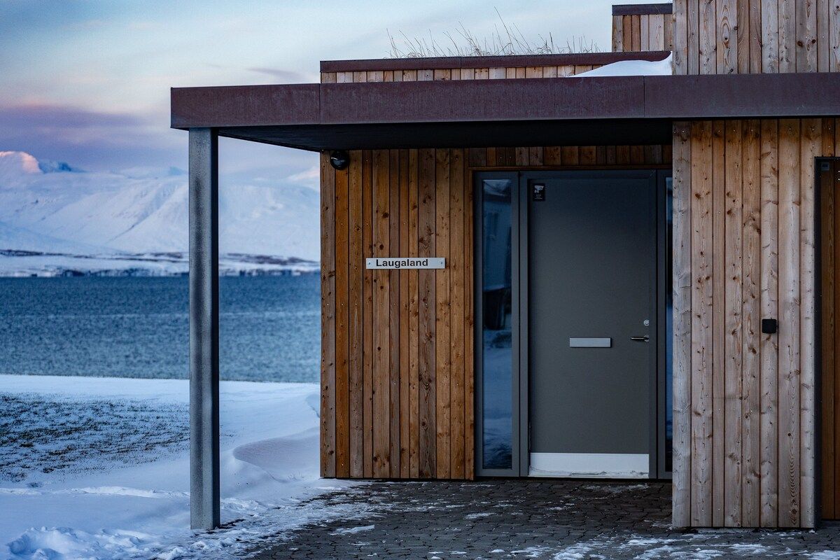 The Laugaland house features traditional Icelandic architecture with grass on the roofs. It has a modern design in black exposed concrete, lots of solid oak wood and an interesting floor plan. The interior has been carefully planned. Features include a fantastic, fully equipped solid wood kitchen, a hot tub with sea views, half of which is open to the sky, and an audiophile stereo system with a library of over 20,000 tracks. In addition to the heated garage, the house’s upscale amenities include its own laundry room. The old Laugaland house used to stand on this plot, but unfortunately it could not be renovated and was therefore replaced with two modern houses. The house has just been completed. The pictures are being updated continuously.